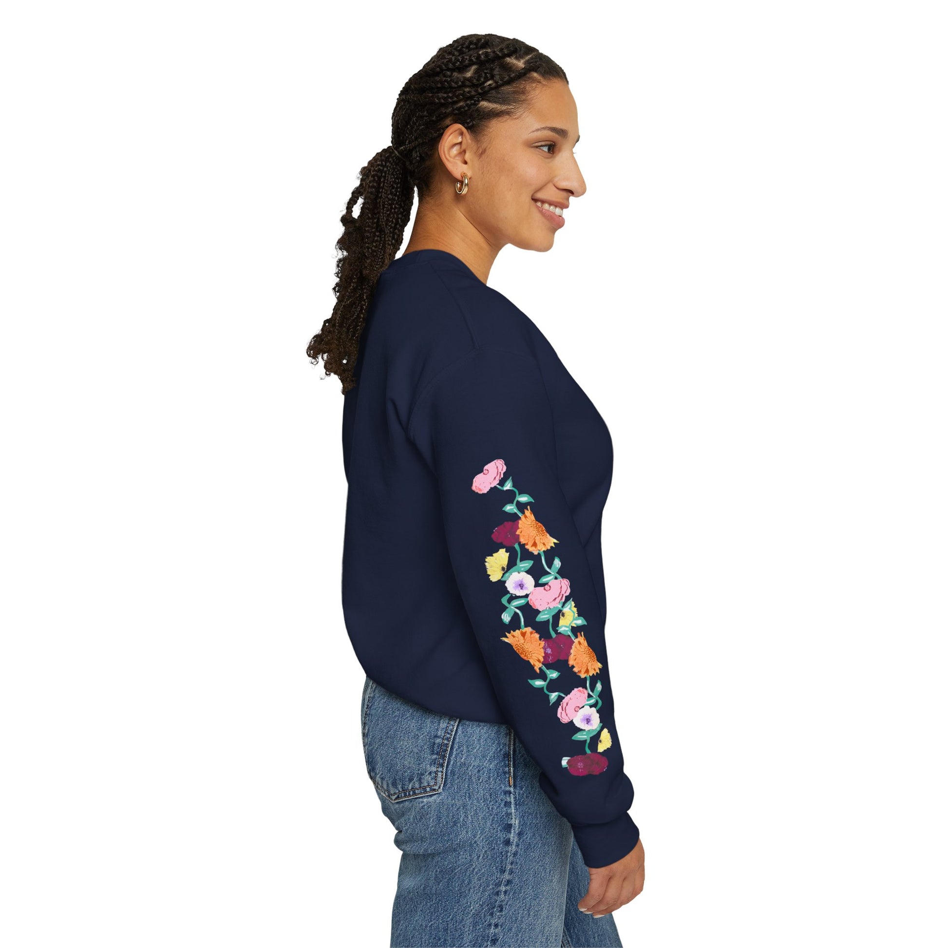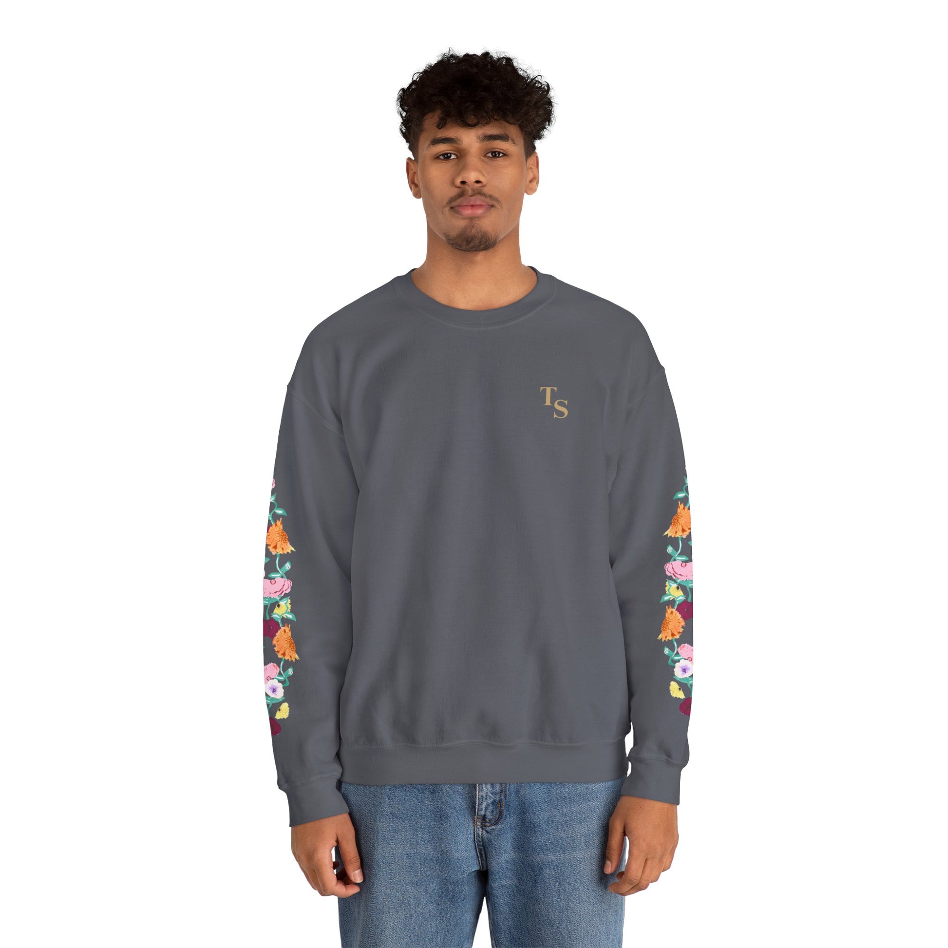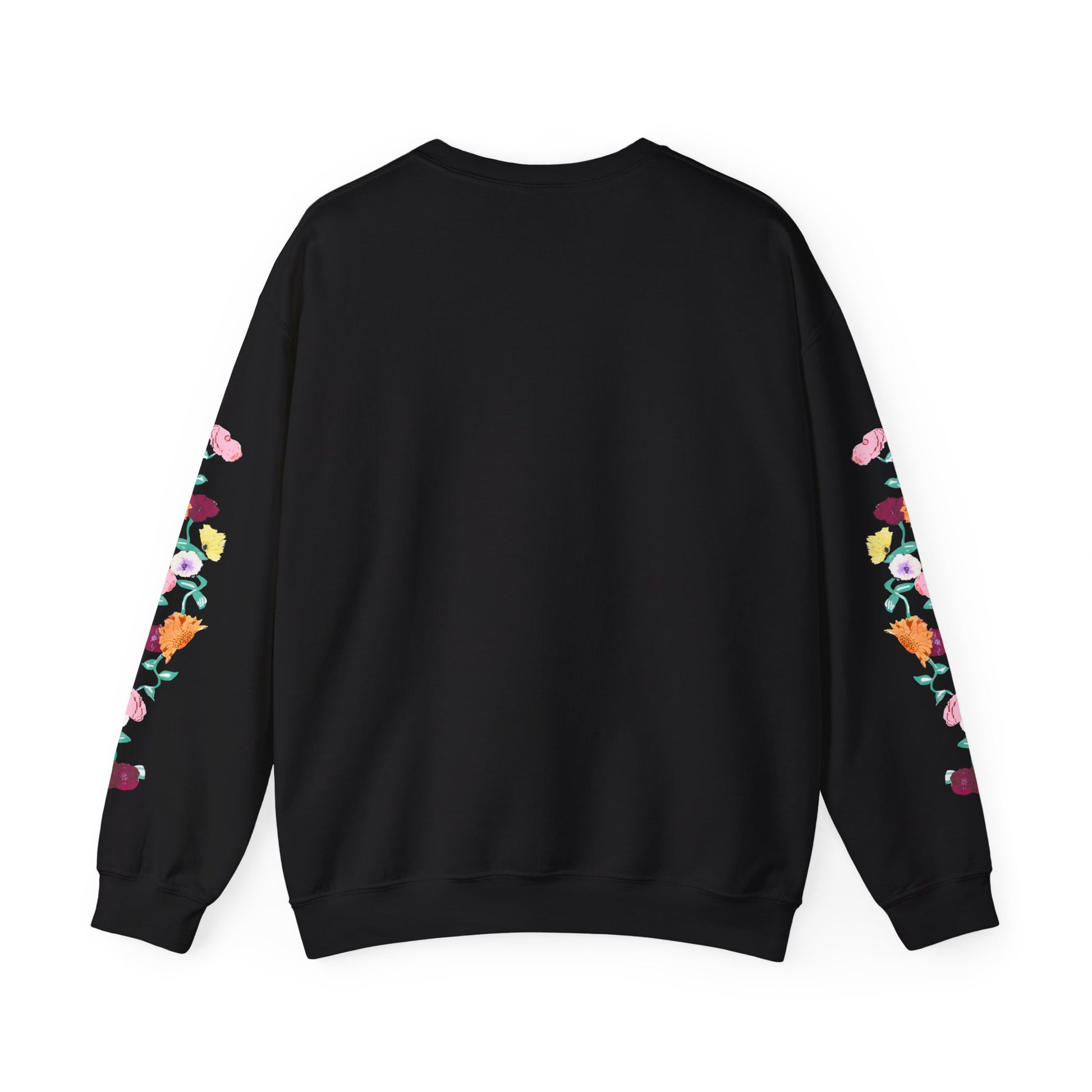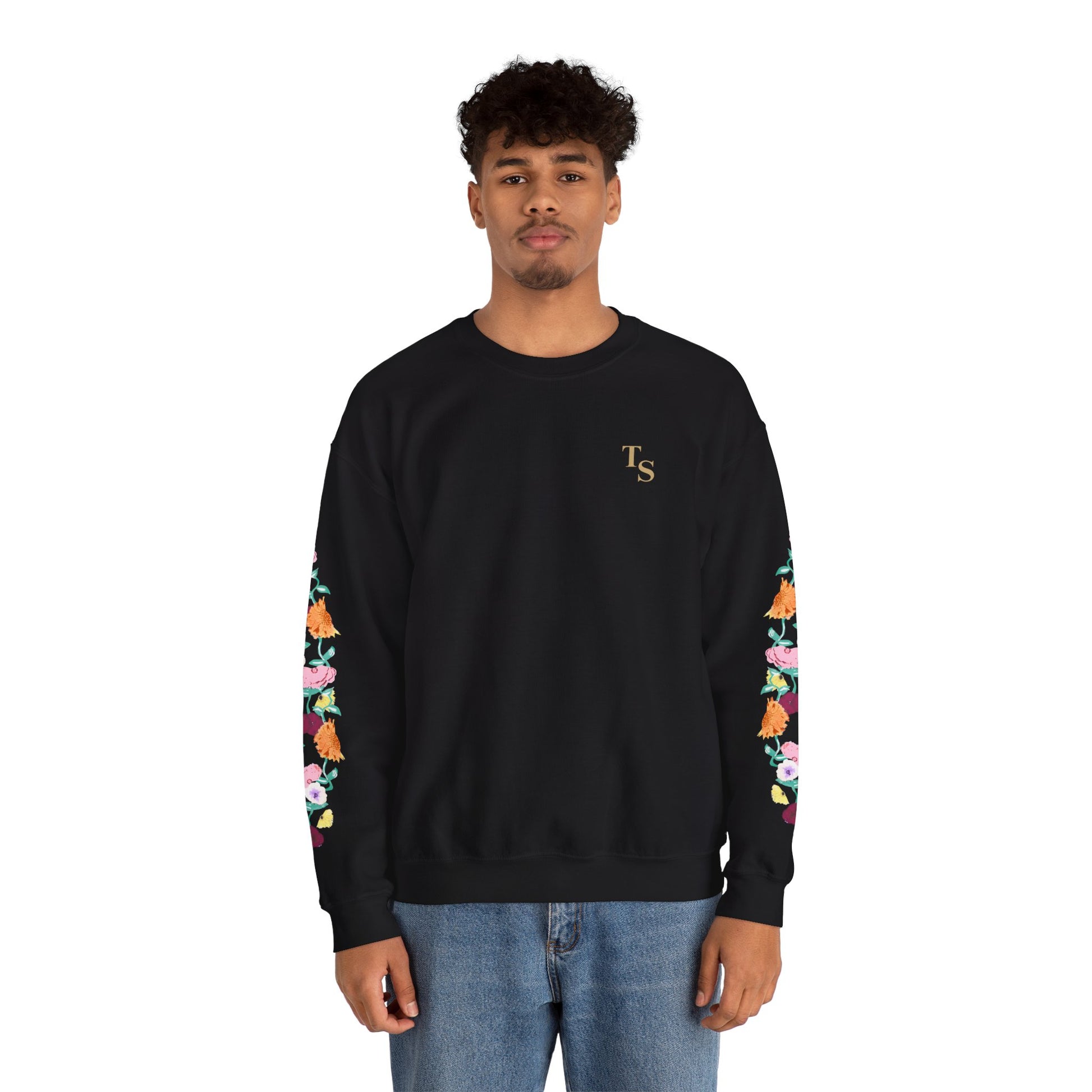 A soft, reliably warm crewneck that blends everyday comfort with a quiet, cultivated vibe. The clean black base keeps the look pared-down while the floral design runs along both sleeves, adding a handcrafted, botanical touch that feels personal rather than loud. A small, tasteful monogram on the left chest balances the sleeve detail, so the sweatshirt reads thoughtful and layered — like a favorite hoodie elevated for coffee shops, long walks, or late-night study sessions. Breathable yet substantial, it settles in easily with jeans or lounge pants and holds its shape through many wears thanks to reinforced seams and a ribbed collar.