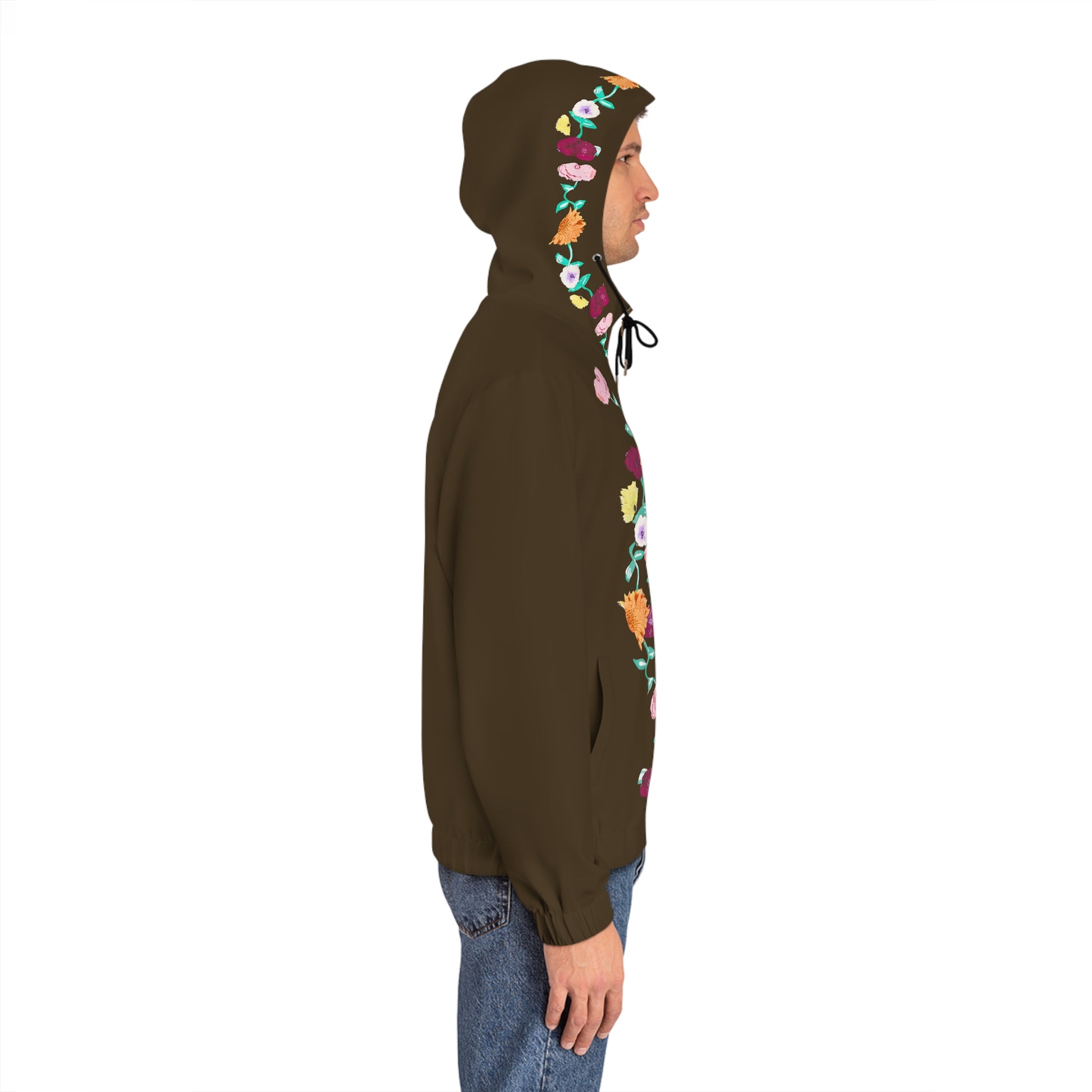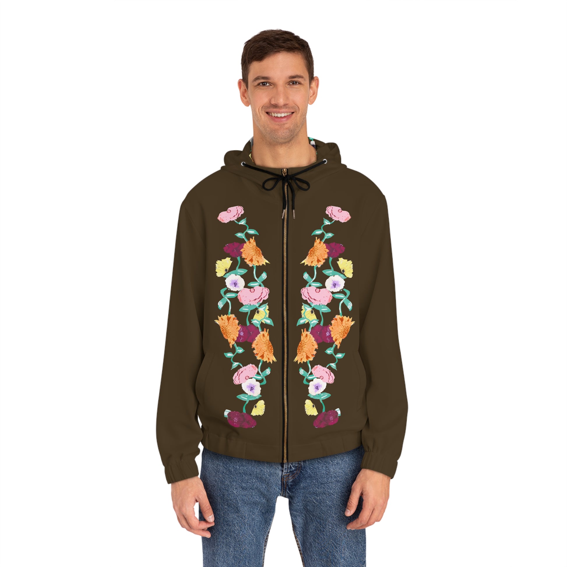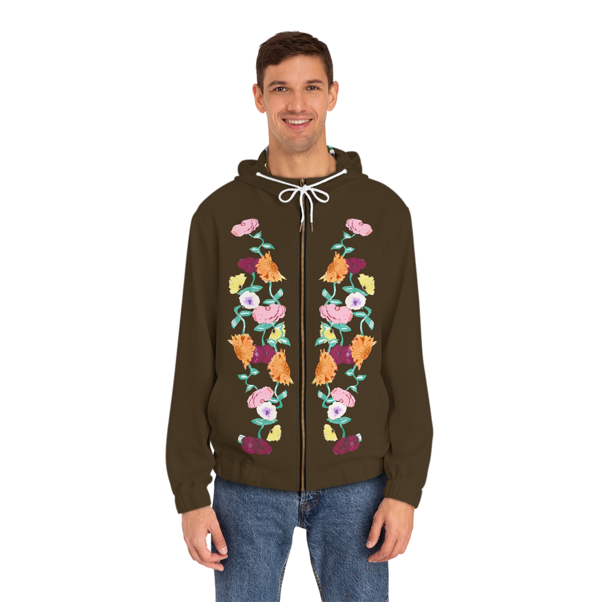 This brown full-zip hoodie brings a quiet, hand-painted garden to everyday wear. Two vertical floral rows trace the front zipper, their warm oranges, soft pinks and pale greens standing out against deep cocoa. The adjustable hood—lined with a subtle blossom repeat—frames the face while the gold-toned metal zipper and clean slanted pockets keep the look practical and refined. Lightweight stretch knit moves with you whether you’re strolling city streets or sipping coffee on a cool morning. It feels lived-in from the first wear: soft against the skin, resilient at the cuffs and hem, and built to keep its shape over time.
