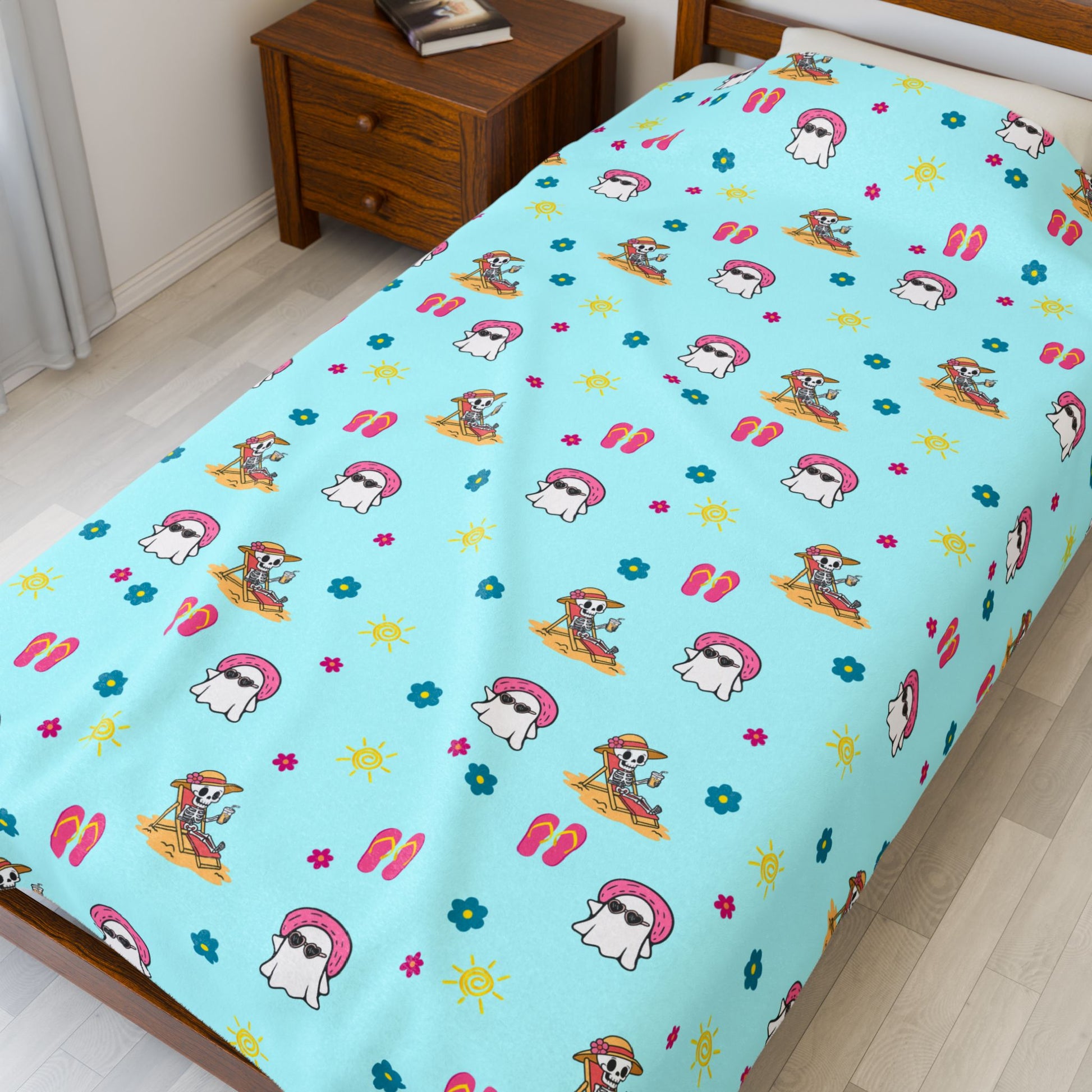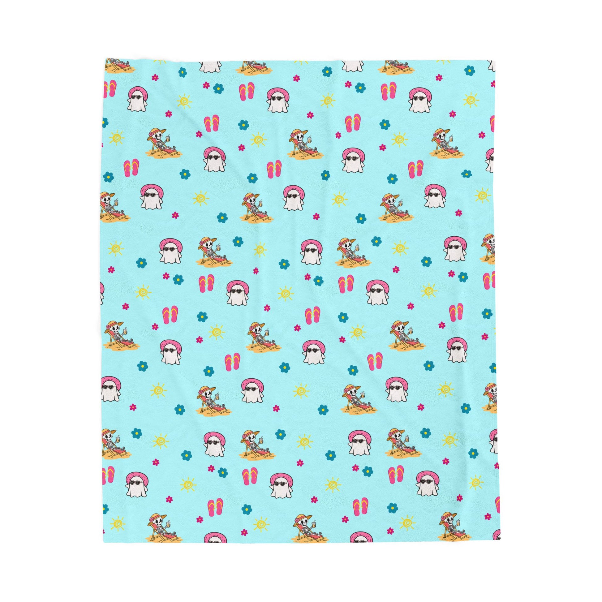 Aqua Summerween Soft Plush Fleece Blanket, Summer Ghosties and Skeletons, Cute Throw Blanket