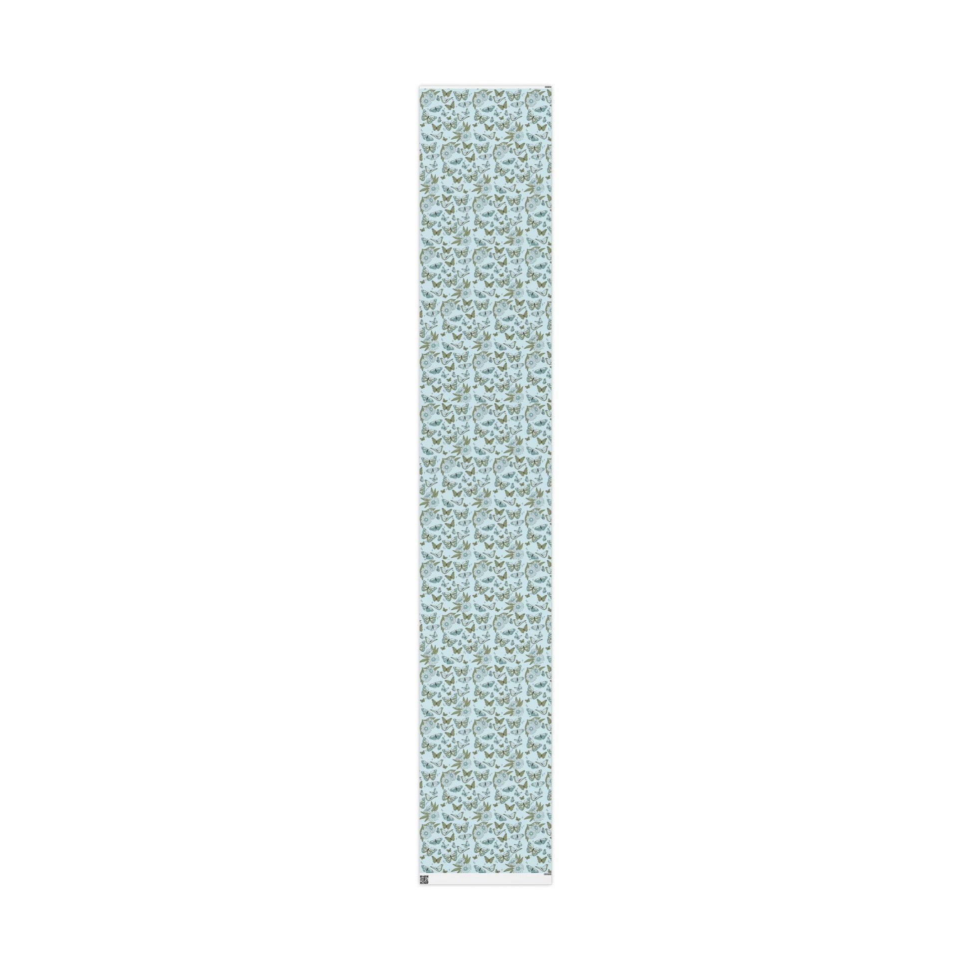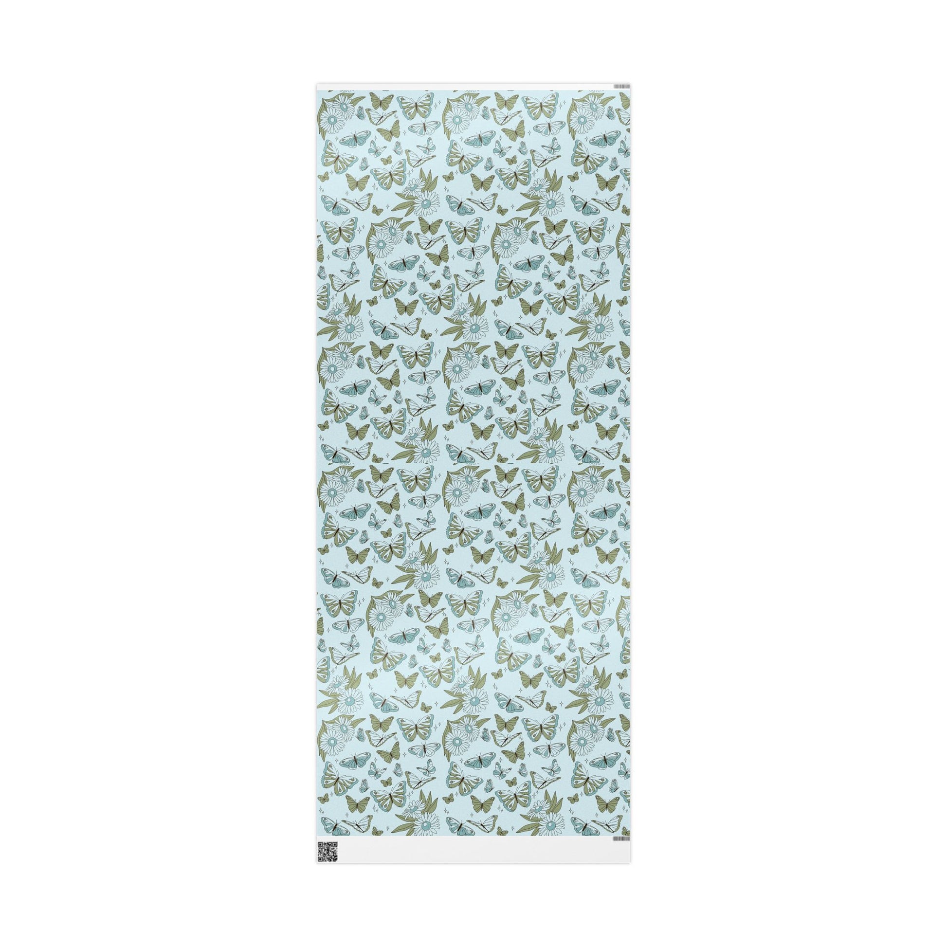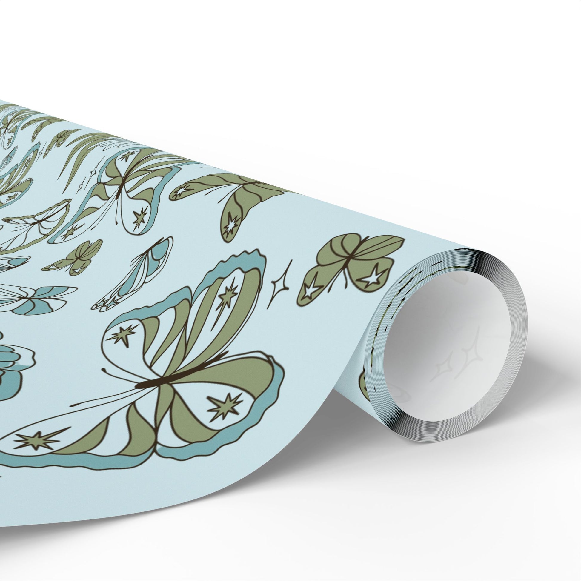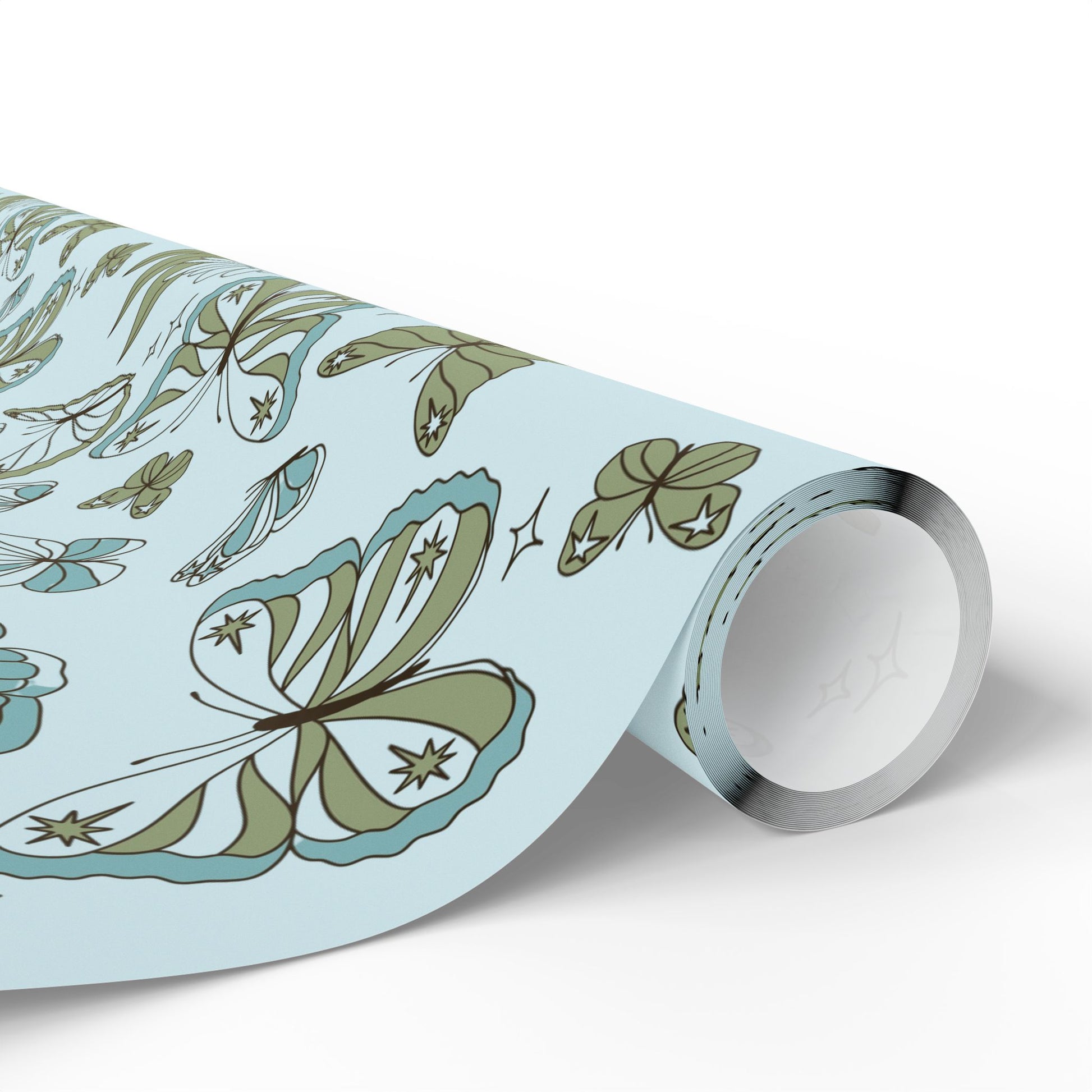 A soft, whimsical roll of botanical-wings wrapping paper that brings a quiet, vintage charm to the moments you give. Pale blue grounds host hand-drawn butterflies, leaves and tiny stars in muted sage and teal — a delicate pattern that feels like pressed flowers in a summer diary. The subtle, airy palette keeps the design gentle and grown-up, while the repeat pattern adds movement across gifts large and small. Use the glossy finish when you want the colors to pop and shimmer under party lights, or choose matte for a paper-like, museum-quality look that photographs beautifully for memory-making occasions. The long format and three size options make it easy to cover boxes, long parcels, and multiple presents without seams shouting for attention. This wrapping paper settles into cozy, thoughtful celebrations — baby showers, garden parties, anniversary trays, or simply a handwritten note left on a doorstep.