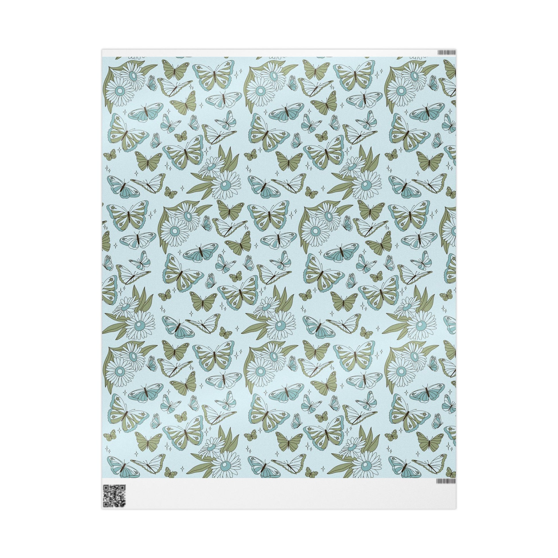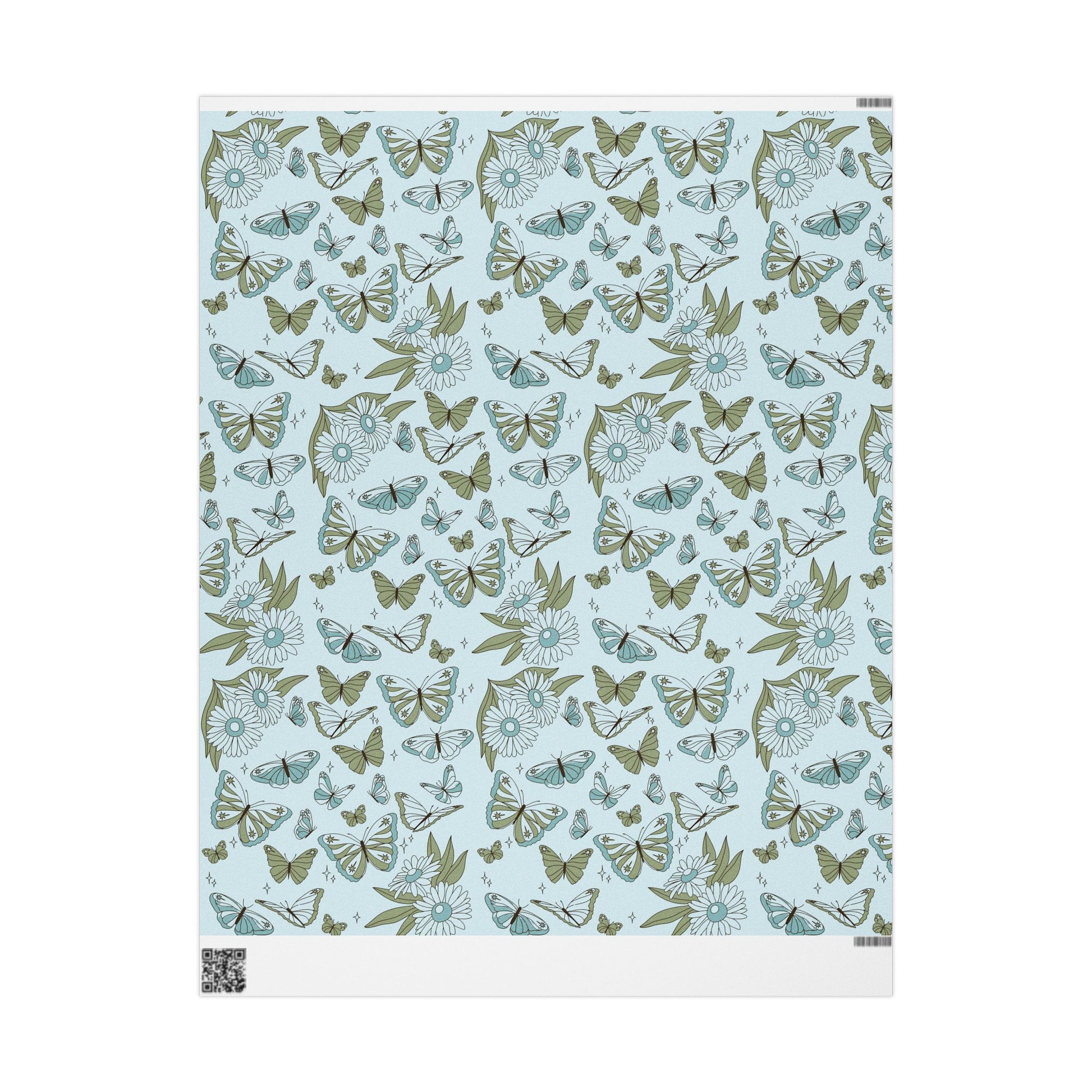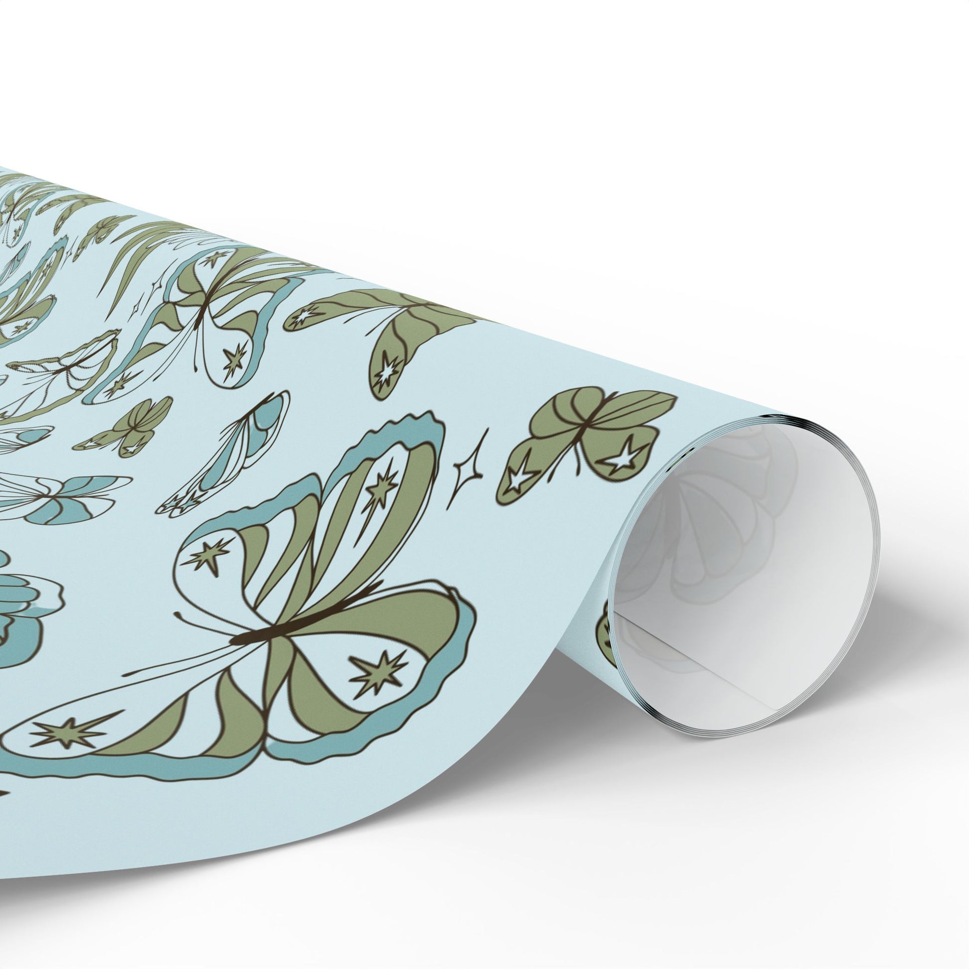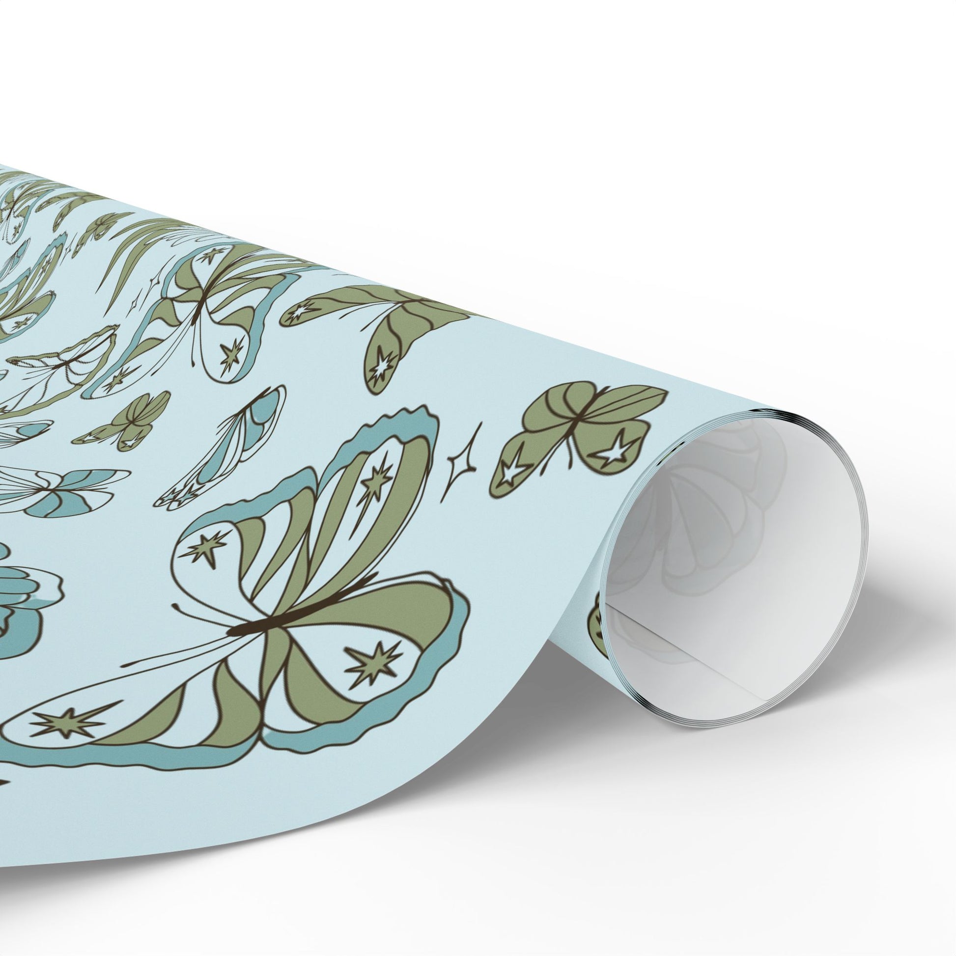 A soft, whimsical roll of botanical-wings wrapping paper that brings a quiet, vintage charm to the moments you give. Pale blue grounds host hand-drawn butterflies, leaves and tiny stars in muted sage and teal — a delicate pattern that feels like pressed flowers in a summer diary. The subtle, airy palette keeps the design gentle and grown-up, while the repeat pattern adds movement across gifts large and small. Use the glossy finish when you want the colors to pop and shimmer under party lights, or choose matte for a paper-like, museum-quality look that photographs beautifully for memory-making occasions. The long format and three size options make it easy to cover boxes, long parcels, and multiple presents without seams shouting for attention. This wrapping paper settles into cozy, thoughtful celebrations — baby showers, garden parties, anniversary trays, or simply a handwritten note left on a doorstep.