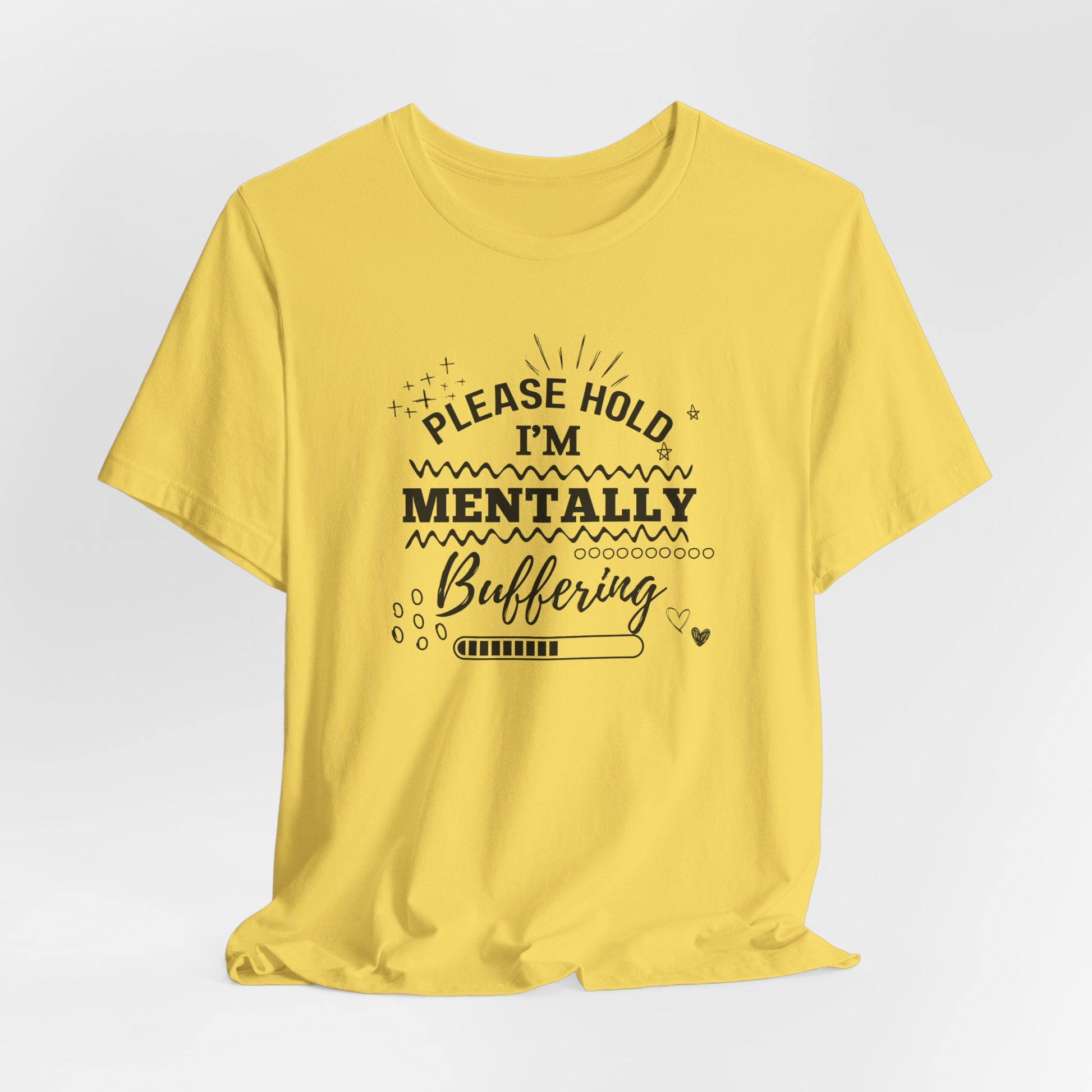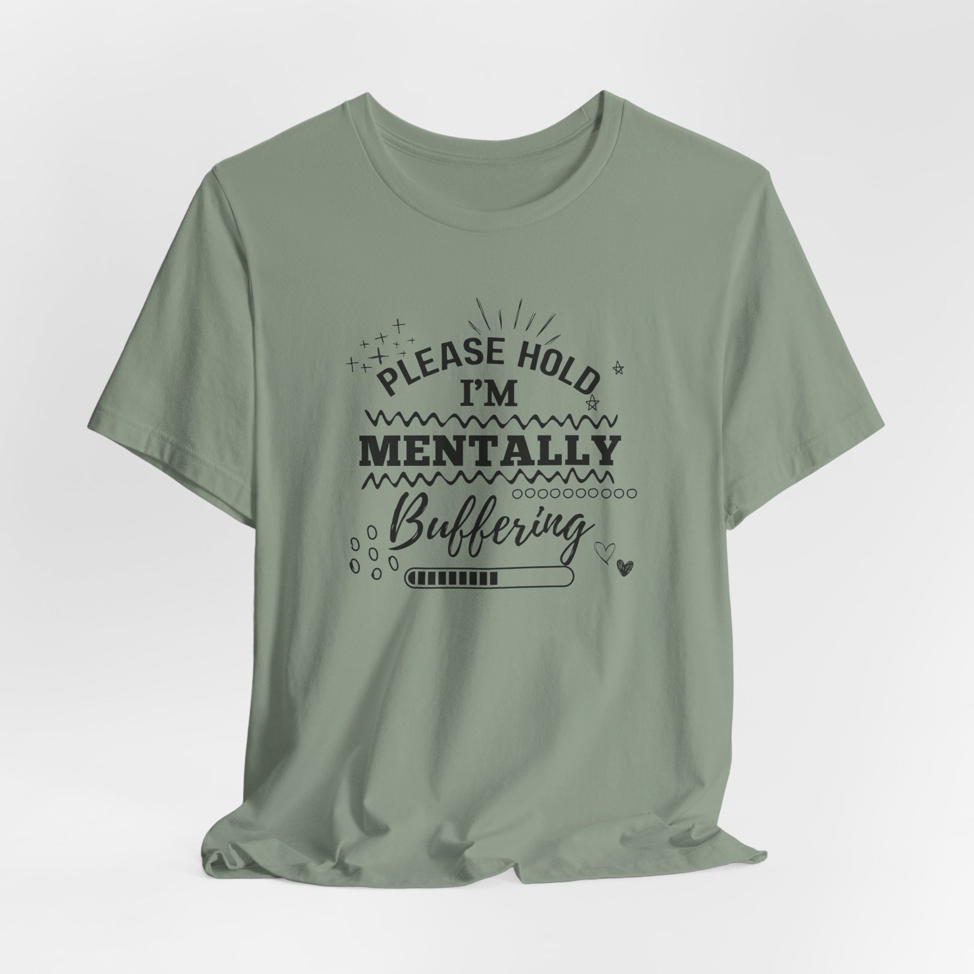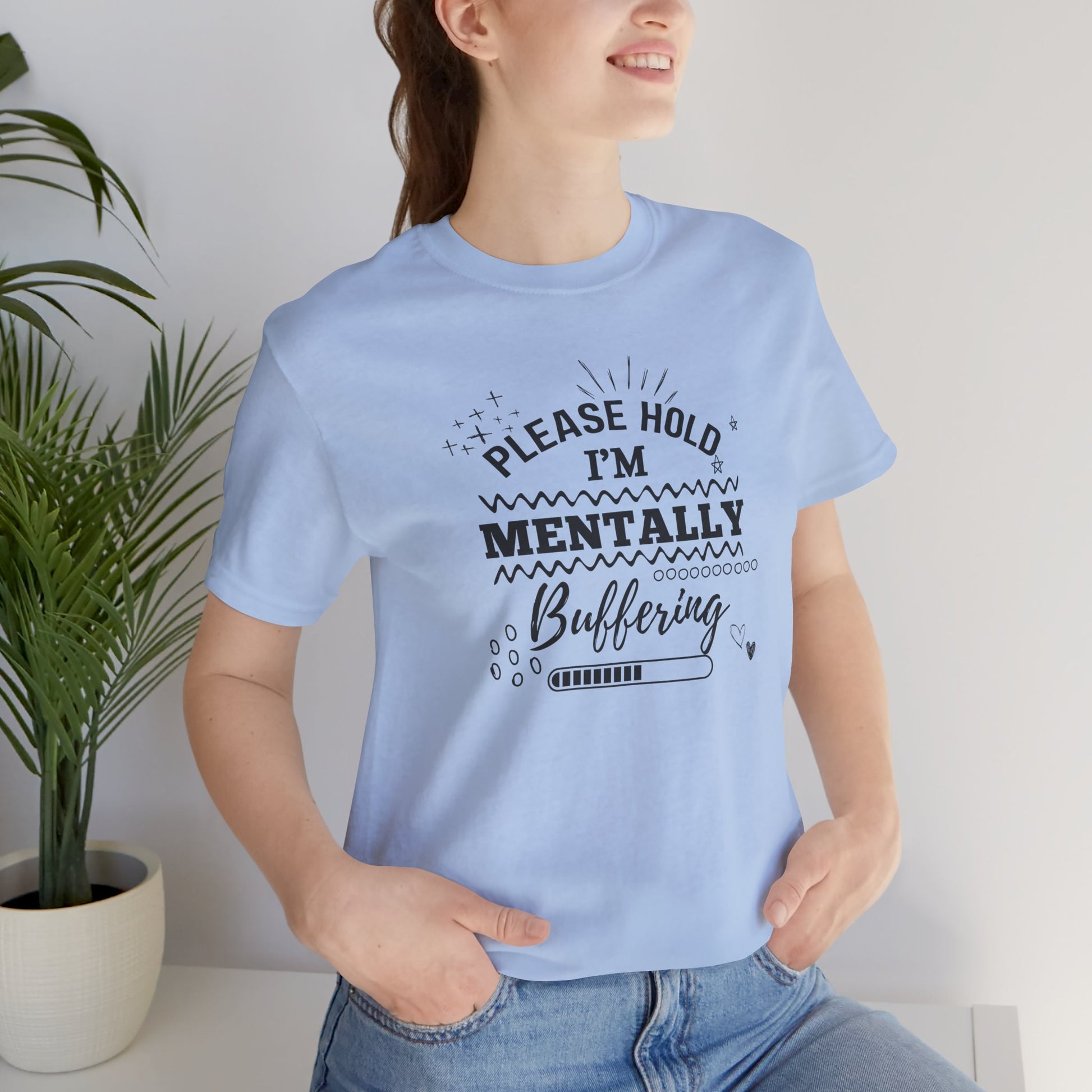 Funny Mental Health Unisex Tee, Please Hold I'm Mentally Buffering Shirt, Casual Gift for Friends, Humor T-Shirt for Stress Relief, [...]