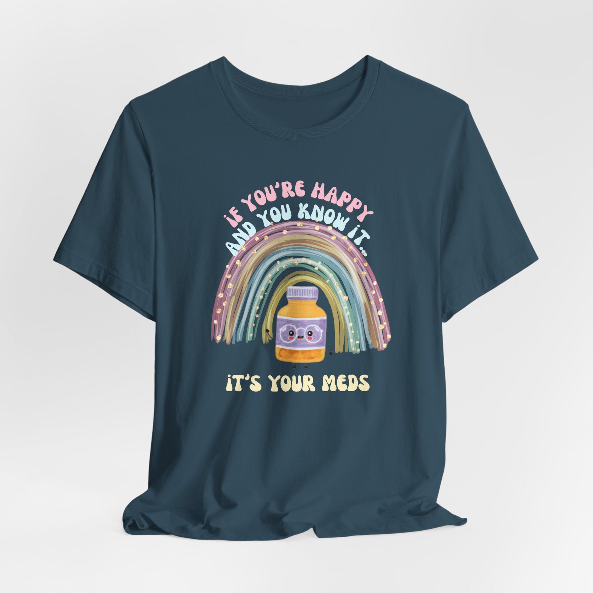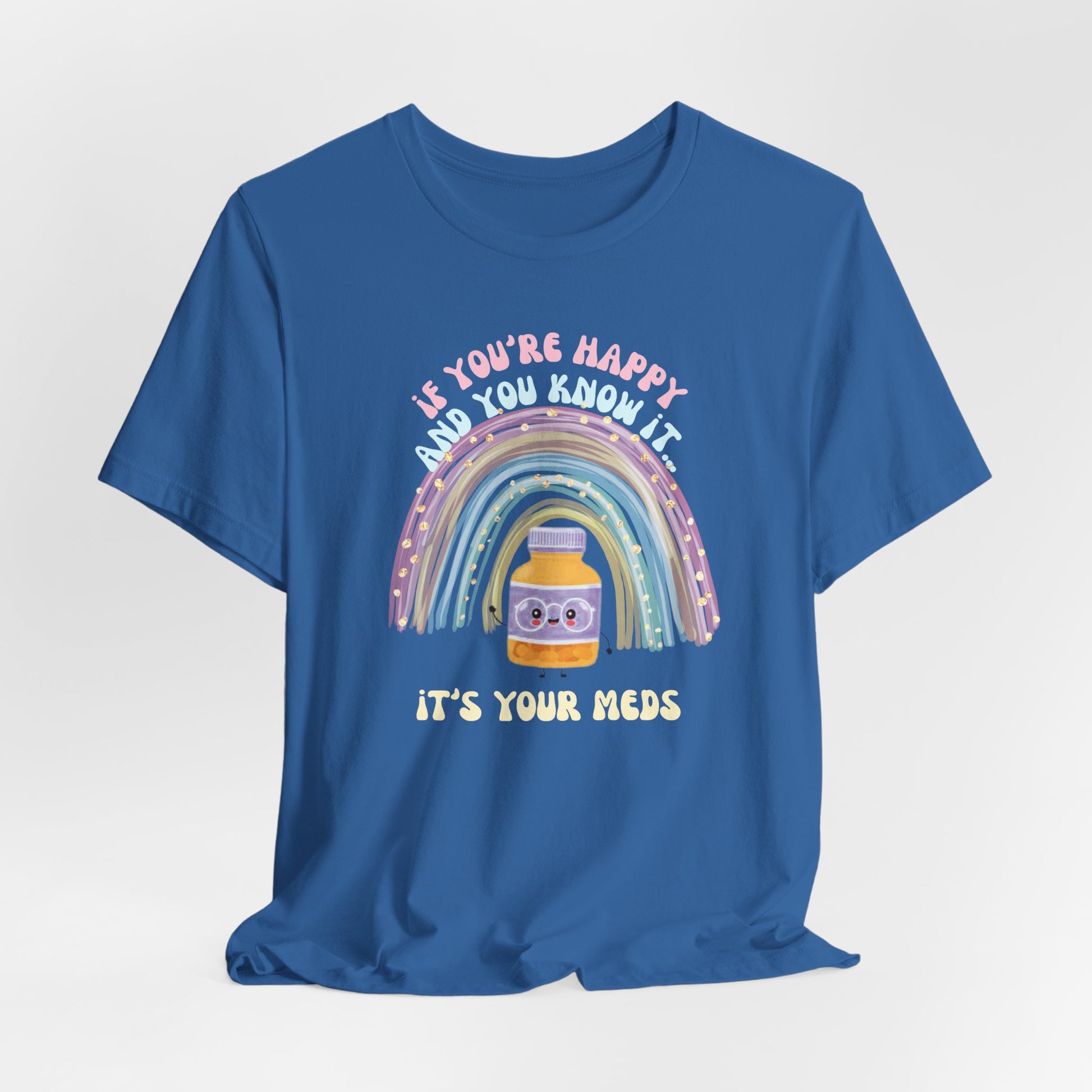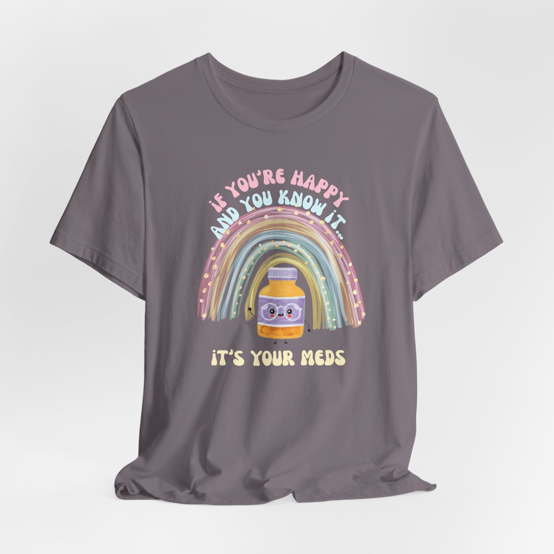 If You're Happy and You Know it, it's your meds - Unisex Jersey Tee, Fun Quirky T-Shirt, Positive Vibes, Gift for Mental Health Awareness, Cheerful Casual Wear