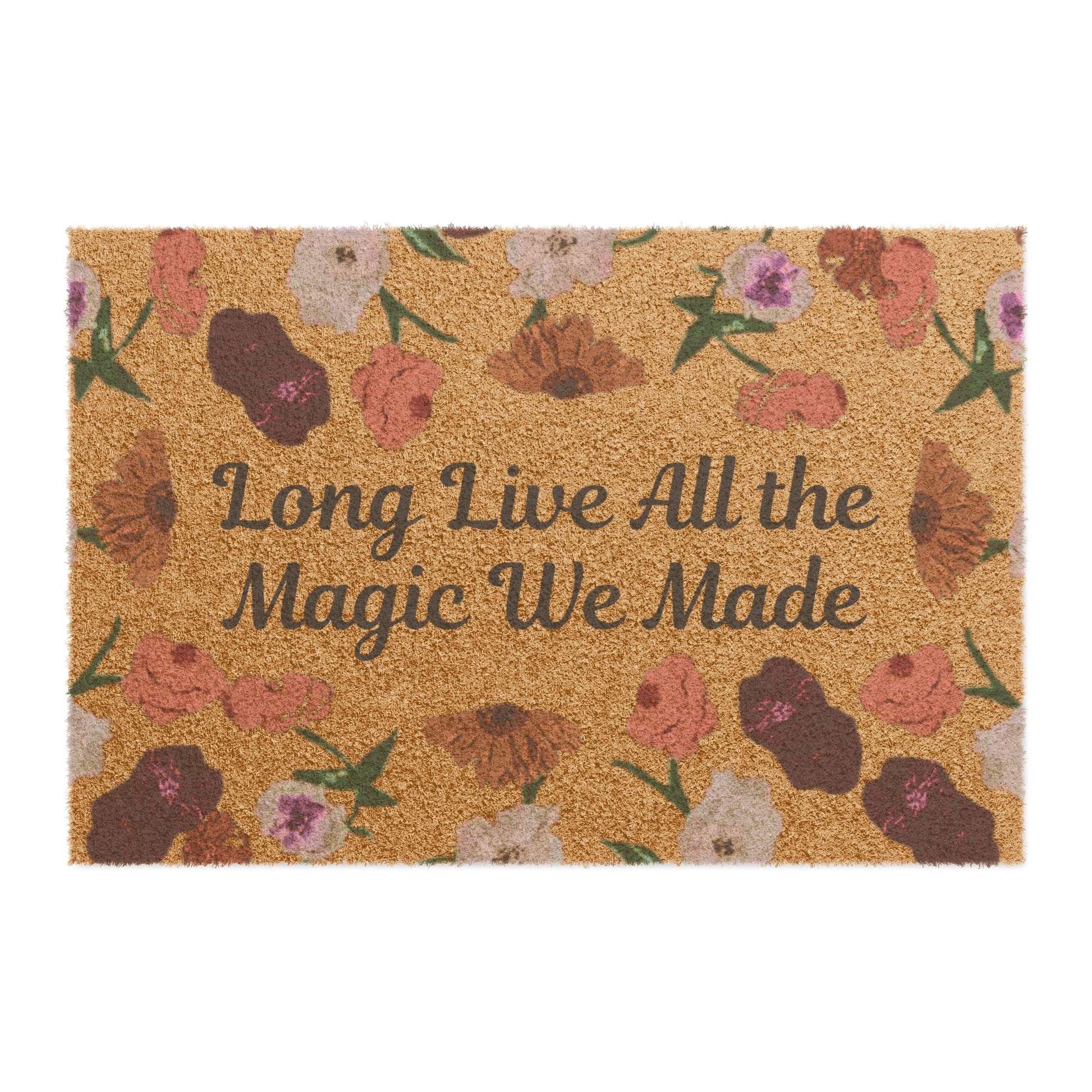 Step onto a welcome that remembers. This coir doormat blends natural coconut fiber with a warm, floral print and a soft handwritten message—an inviting pause before you cross the threshold. Its textured surface scrapes dirt from shoes while the dense face holds color and pattern, and the sturdy black vinyl backing keeps the mat in place on porches and entryways. Weather-ready and earth-friendly, it brings a lived-in, nostalgic charm to every arrival and farewell.