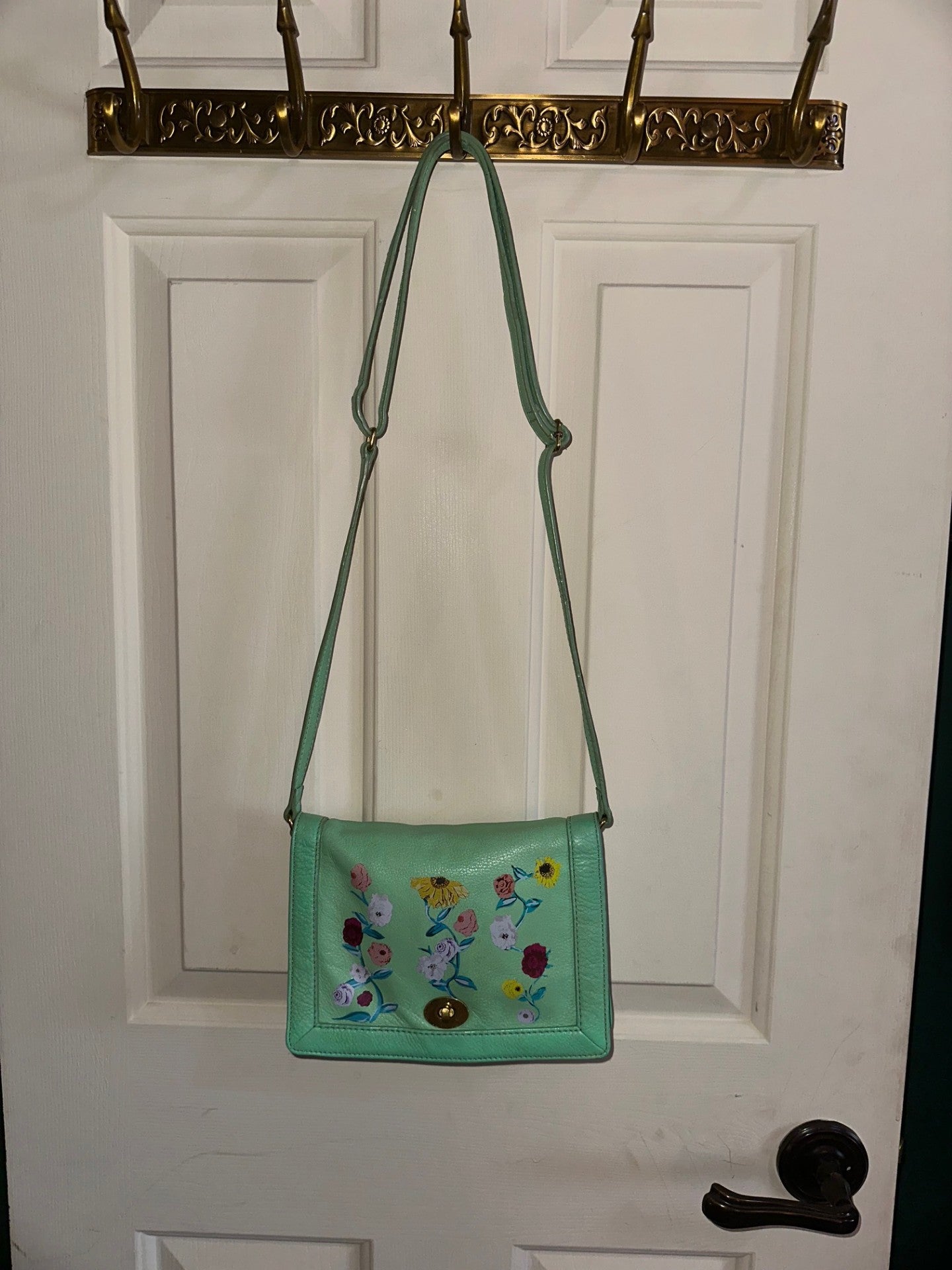 Introducing our Pre-Loved J Crew Mint Green Leather Crossbody, featuring a hand-decorated floral pattern from Taylor's iconic acoustic piano from The Eras Tour.